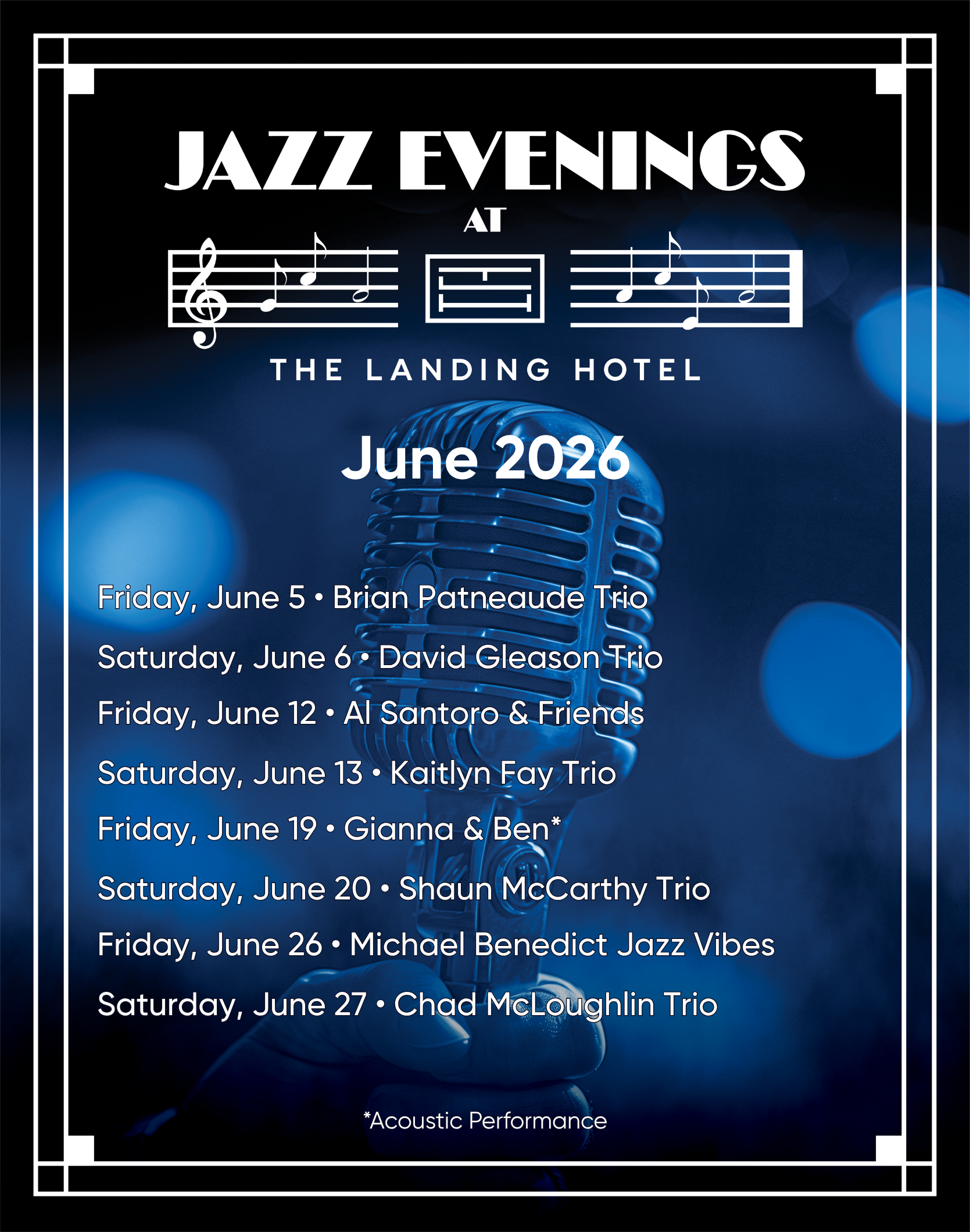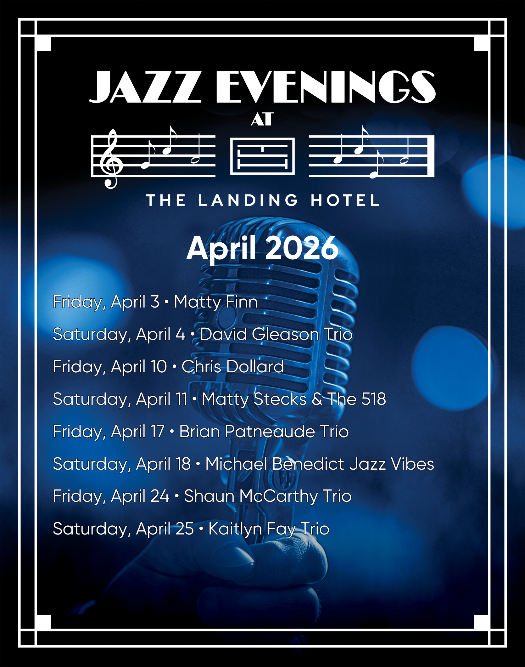 Welcome to The Landing Hotel, your premier destination for a weekend escape. As the sun sets, Jazz Evenings takes center stage inside our elegant hotel lobby. Immerse yourself in the smooth sounds of live jazz music while sipping on a perfectly crafted cocktail from 6PM-9PM.