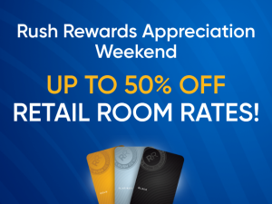 Invited Rush Rewards Members can receive up to 50% off retail room rates on their stay from May 1-May 3. Restrictions may apply.